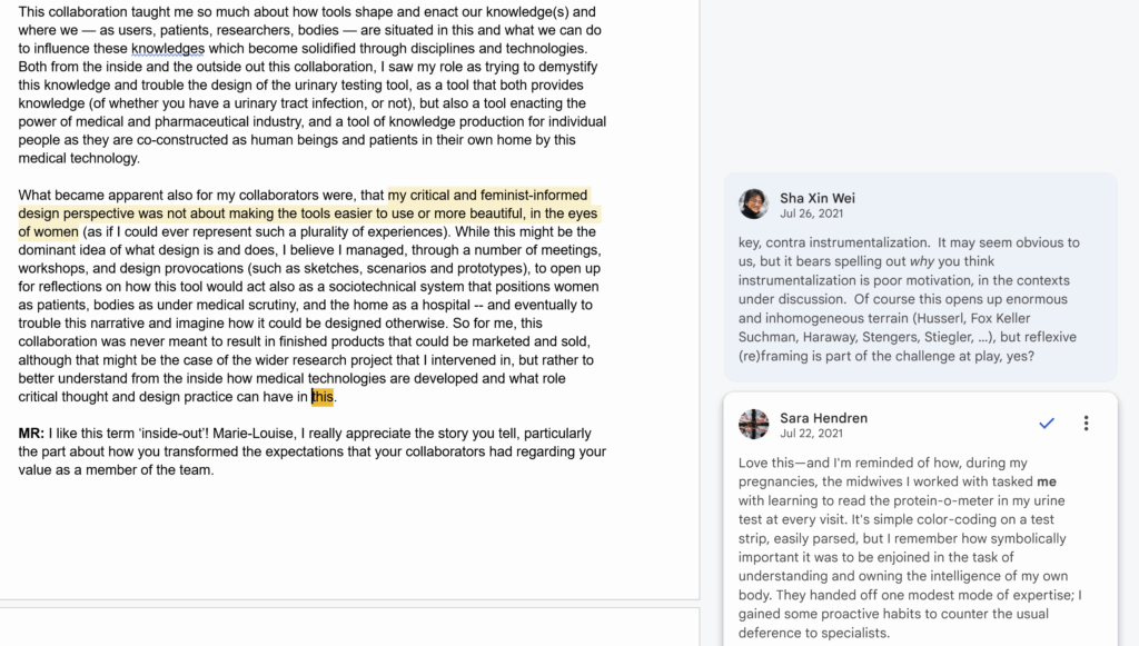 Theconversation, which evolved over a couple of months in 2021, involved two main participants and three commentators. It turned out rich and generous. Although the format had been imagined to be fairly chronological (something the curator encouraged) this model was challenged in several ways, not least through commenting (using google doc’s commenting feature).